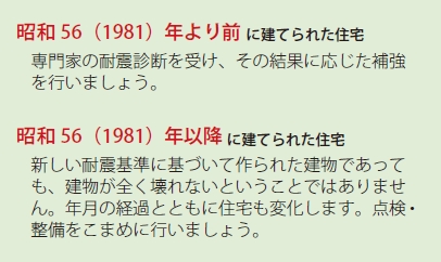 昭和56(1981)年に建築物の新耐震基準が施行され、住宅の建物の強さを決める基準は大きく変わりました。この年以降に建てられているどうかが、自分の家の強度を知るひとつの手がかりとなります。