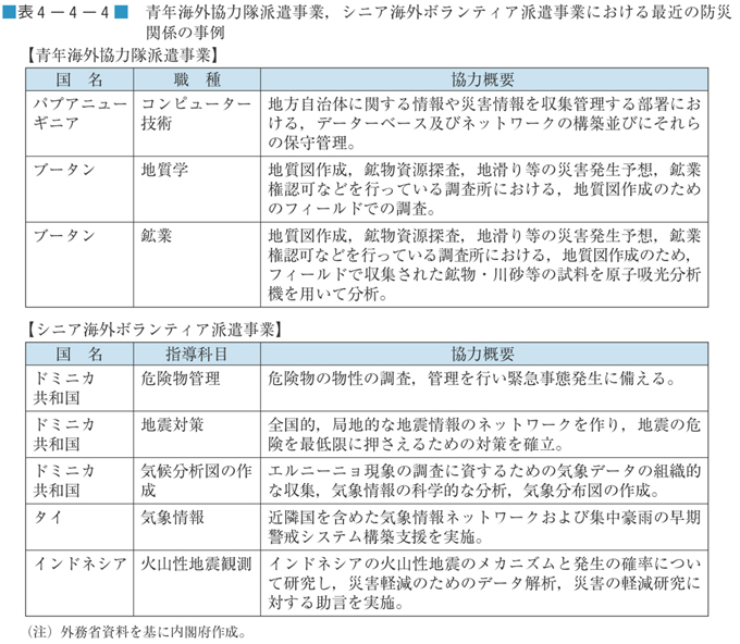 内閣府ホーム > 内閣府の政策 > 防災情報のページ > 会議・検討会 > 防災白書 > 平成15年版防災白書 > 表4−4−4 青年海外協力隊派遣事業シニア海外ボランティア派遣事業における最近の防災関係の事例