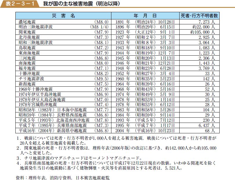 > 表2−3−1 我が国の主な被害地震(明治以降)