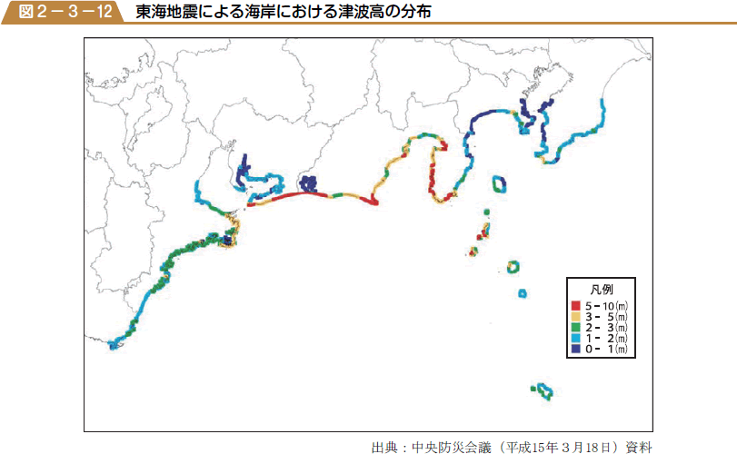 > 図2−3−12 東海地震による海岸における津波高の分布