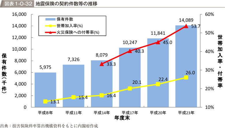 > 平成25年版 防災白書|図表1-0-32 地震保険の契約件数等の推移