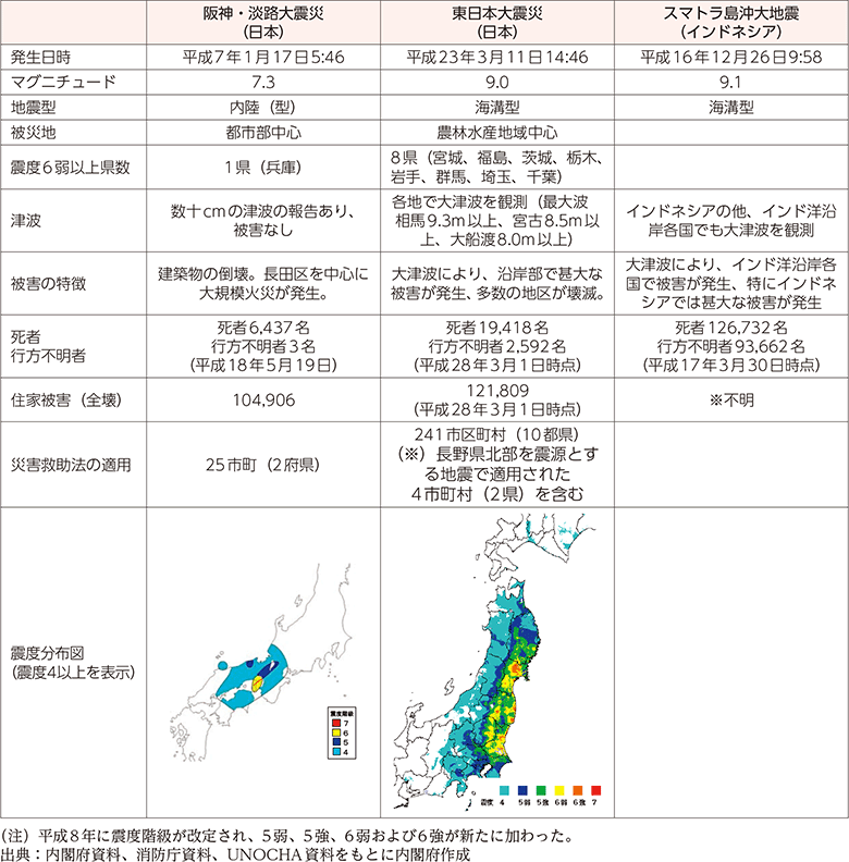 内閣府ホーム > 内閣府の政策 > 防災情報のページ > 会議・検討会 > 防災白書 > 平成28年版 防災白書 > 平成28年版 防災白書|附属資料18 東日本大震災、スマトラ島沖大地震、阪神・淡路大震災の比較