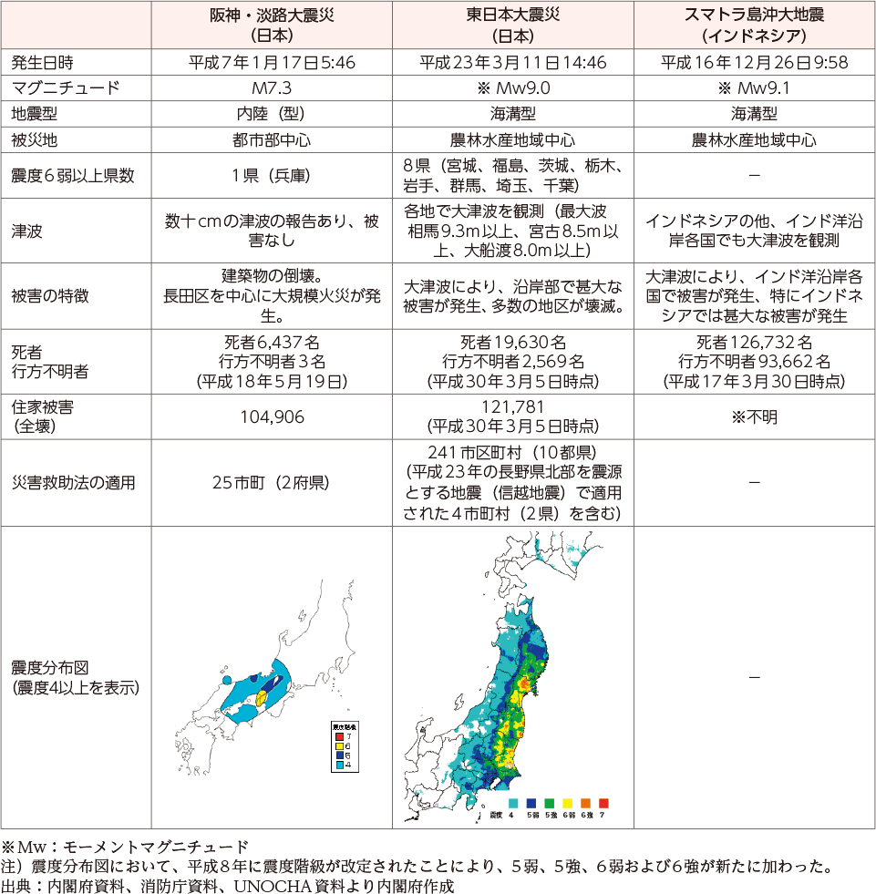 内閣府ホーム > 内閣府の政策 > 防災情報のページ > 会議・検討会 > 防災白書 > 平成30年版 防災白書 > 平成30年版 防災白書|附属資料18 阪神・淡路大震災、東日本大震災、スマトラ島沖大地震の比較