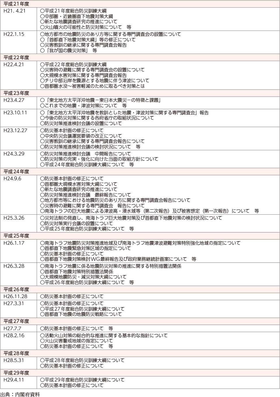 内閣府ホーム > 内閣府の政策 > 防災情報のページ > 会議・検討会 > 防災白書 > 平成30年版 防災白書 > 平成30年版 防災白書|附属資料32 近年の中央防災会議の開催状況(平成21年度以降)