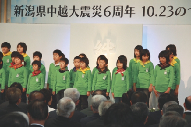 また、一時全村避難した旧山古志村(現長岡市)の山古志小学校の児童32人が被災体験などをつづった歌「ありがとう」など2曲を合唱しました。