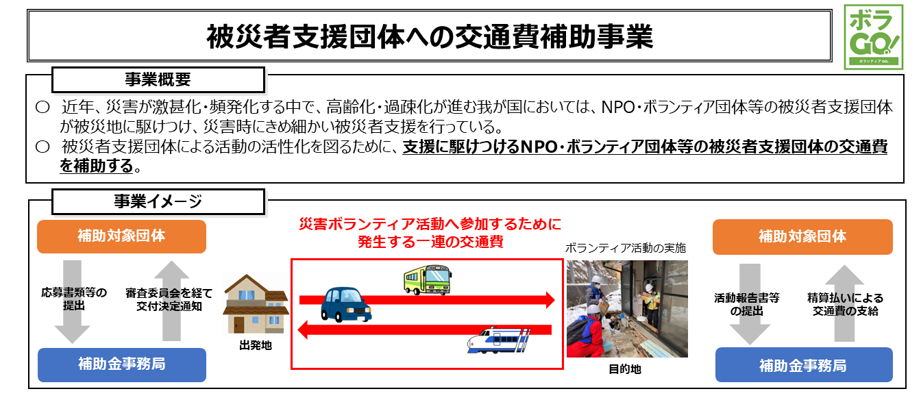 〇このような支援活動の活性化を図るため、令和6年度に支援に駆けつける被災者支援団体の交通費補助事業を開始し、 令和7年度についても継続して実施することになりました。