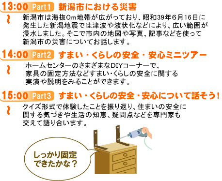さまざまな工作用品や防災用品がならぶ「ホームセンター」を会場にして、私たちが住む 新潟市の地形や過去に発生した災害を知り、「住まい・暮らしの安全・安心」についていま 自分たちでできることをみんなで考え、話し合ってみませんか。 どうぞ、ご家族・ご近所 お誘い合わせのうえ、「ぼうさいカフェ in にいがた」にふるってご参加ください!