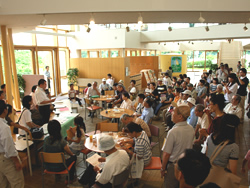 開会式は、「わろうべの里」志村センター長の司会で始まり、高橋四街道市長、鳥巣内閣府参事官(新潟県中越沖地震対応で欠席のため渡部参事官補佐が代読)からご挨拶頂きました。 本日のコーディネーター、鍵屋さん(板橋区総務部契約管財課長/NPO法人 東京いのちのポータルサイト理事)の紹介が終わると「ぼうさいカフェ」いよいよオープンです!