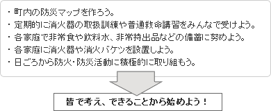1. 阪神・淡路大震災では、多くの家がつぶれて何万もの人が下敷きになったり、閉じ込められたりしたが、ほとんどは顔見知りである近所の人に救出された。また、火災が発生したときに、被害を最小限にとどめたのも、日ごろからの連帯が強い地域であった。このように、災害が起こったときに大きな力を発揮するのは、家庭や地域のつながりが重要との教訓から、京都市では、平成12年から、顔見知りの町内単位で構成する自主防災部の住民自らが、自分たちのまちの防災について考え、話し合い(ワークショップ形式)、その内容を防災行動計画としてまとめた町内版の地域防災計画である、身近な地域の「市民防災行動計画」づくりを推進している。