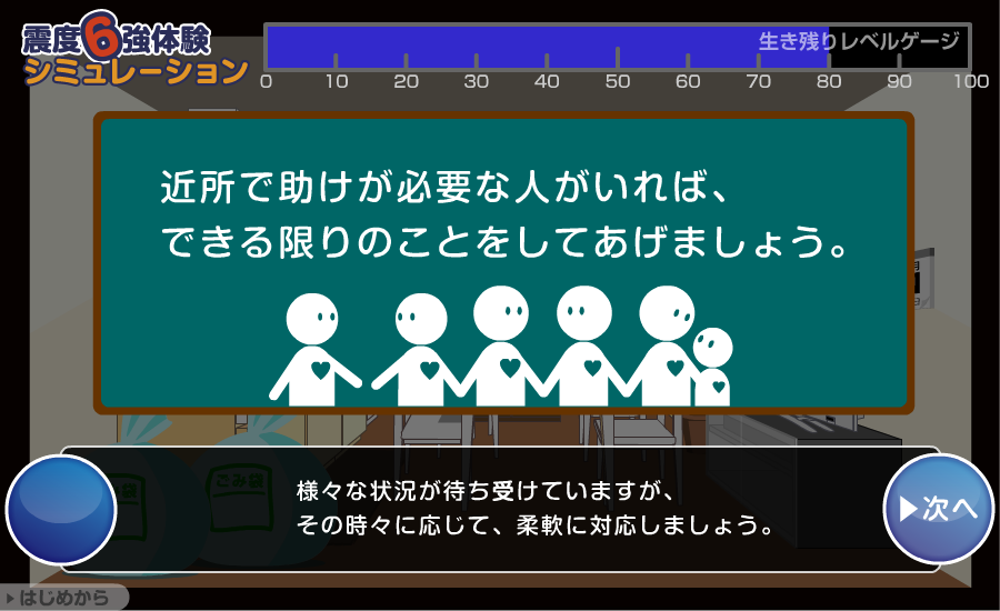 このゲームは、震度6強の地震に対して、「どんな予防対策を取らなくてはいけないか?」「どんな避難行動をとるべきか?