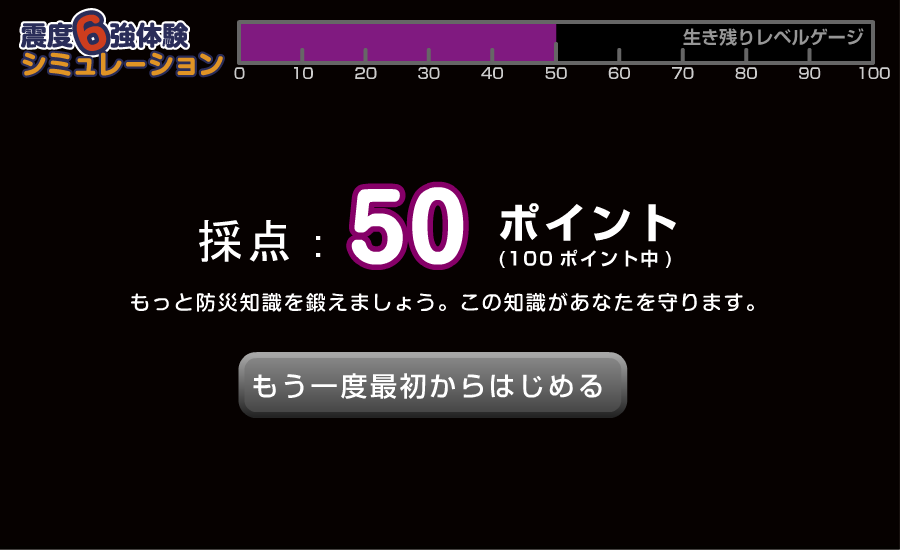 このゲームは、震度6強の地震に対して、「どんな予防対策を取らなくてはいけないか?」「どんな避難行動をとるべきか?