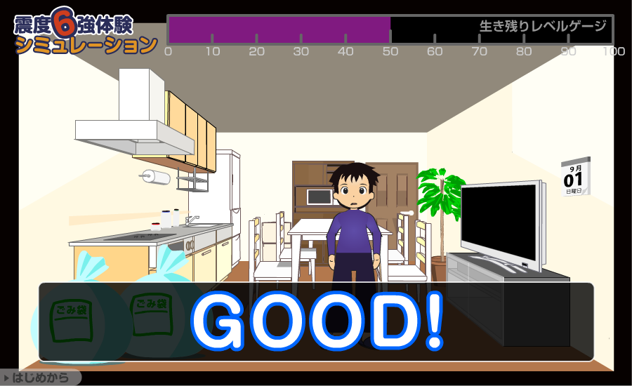 このゲームは、震度6強の地震に対して、「どんな予防対策を取らなくてはいけないか?」「どんな避難行動をとるべきか?」