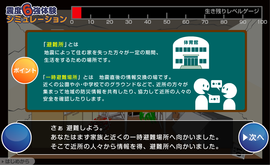このゲームは、震度6強の地震に対して、「どんな予防対策を取らなくてはいけないか?」「どんな避難行動をとるべきか?」