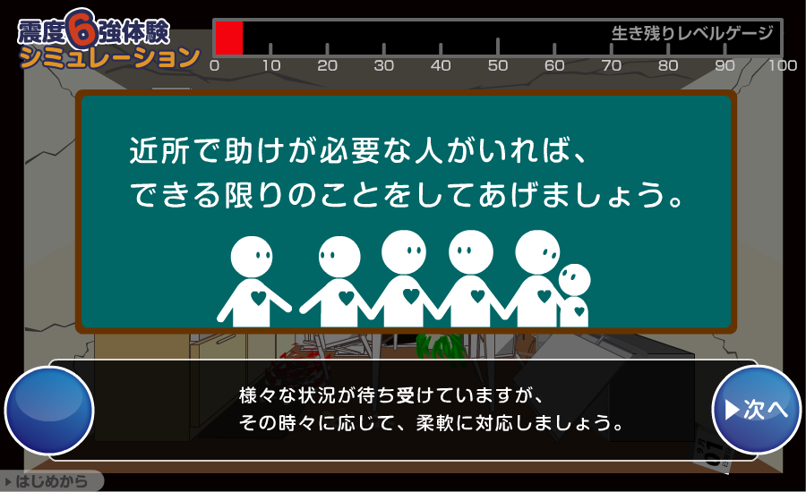 このゲームは、震度6強の地震に対して、「どんな予防対策を取らなくてはいけないか?」「どんな避難行動をとるべきか?」