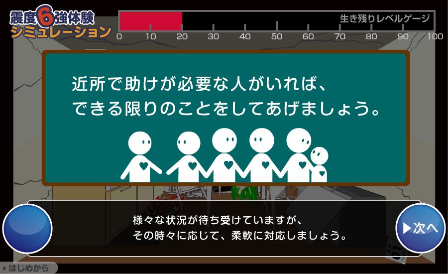 このゲームは、震度6強の地震に対して、「どんな予防対策を取らなくてはいけないか?」「どんな避難行動をとるべきか?
