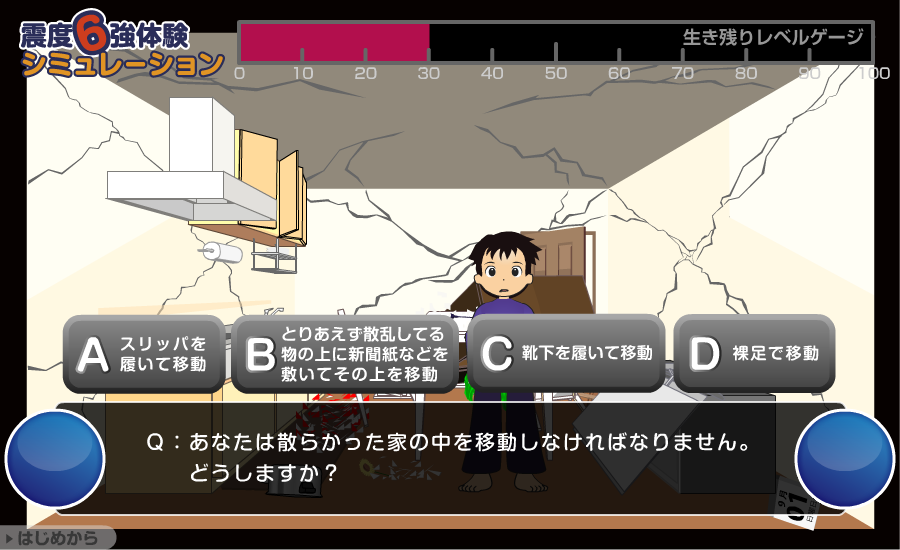 このゲームは、震度6強の地震に対して、「どんな予防対策を取らなくてはいけないか?」「どんな避難行動をとるべきか?