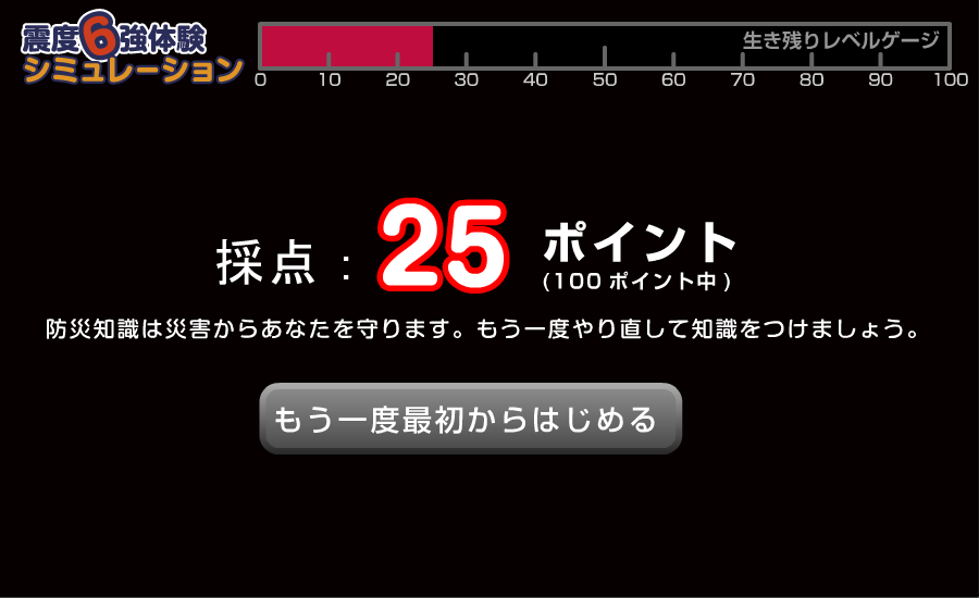 このゲームは、震度6強の地震に対して、「どんな予防対策を取らなくてはいけないか?」「どんな避難行動をとるべきか?